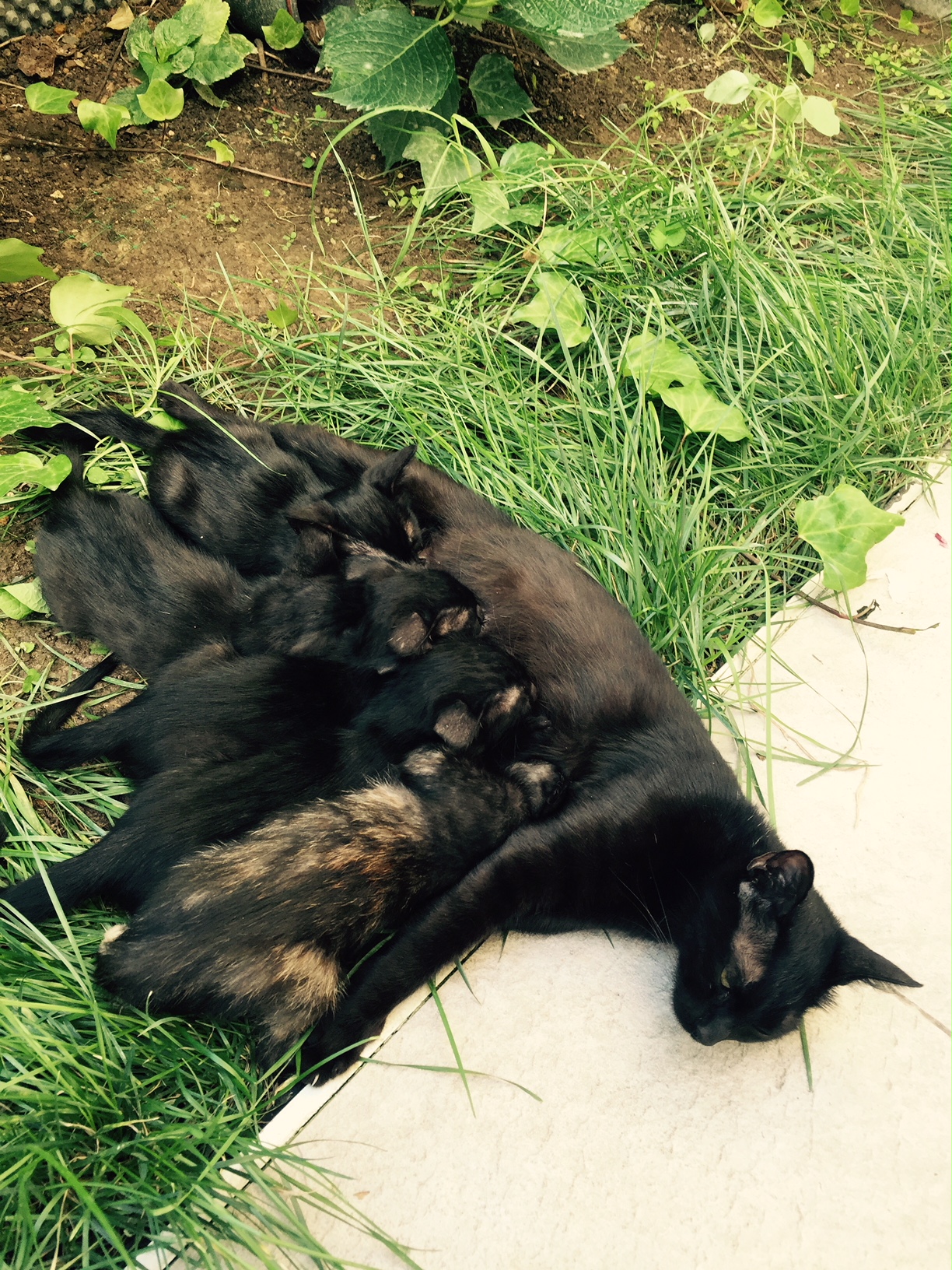 Bir süre sonra sanki şişmanlamaya başlıyor. İlk başta anlamıyoruz ama kendisi hamileymiş meğer. Bir süre ortadan kayboluyor. Döndüğünde ağzında bir yavru kedi. Getirip bırakıyor, sonra bir tane daha getiriyor, bir tane daha derken, bahçeye tam 5 kedi yavrusu getiriyor. 4 erkek, 1 kız.